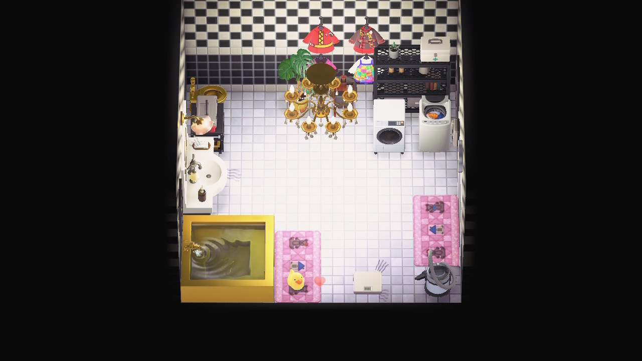 An exception to this is the bathroom, comprised of furniture from the Golden series and features mostly black and white compared to the heavy amount of red seen in the other parts of her home.